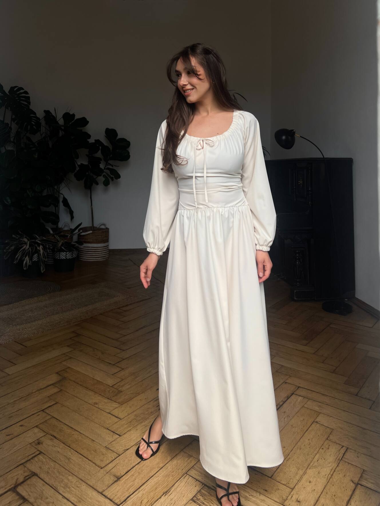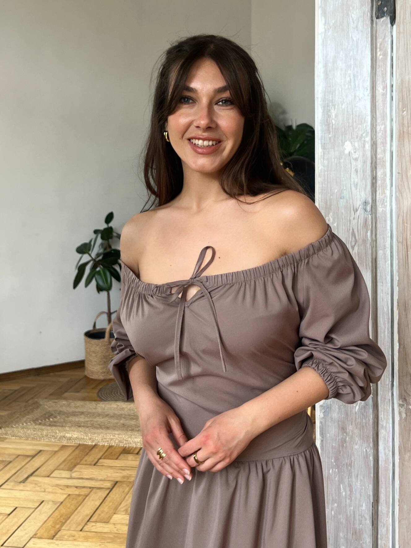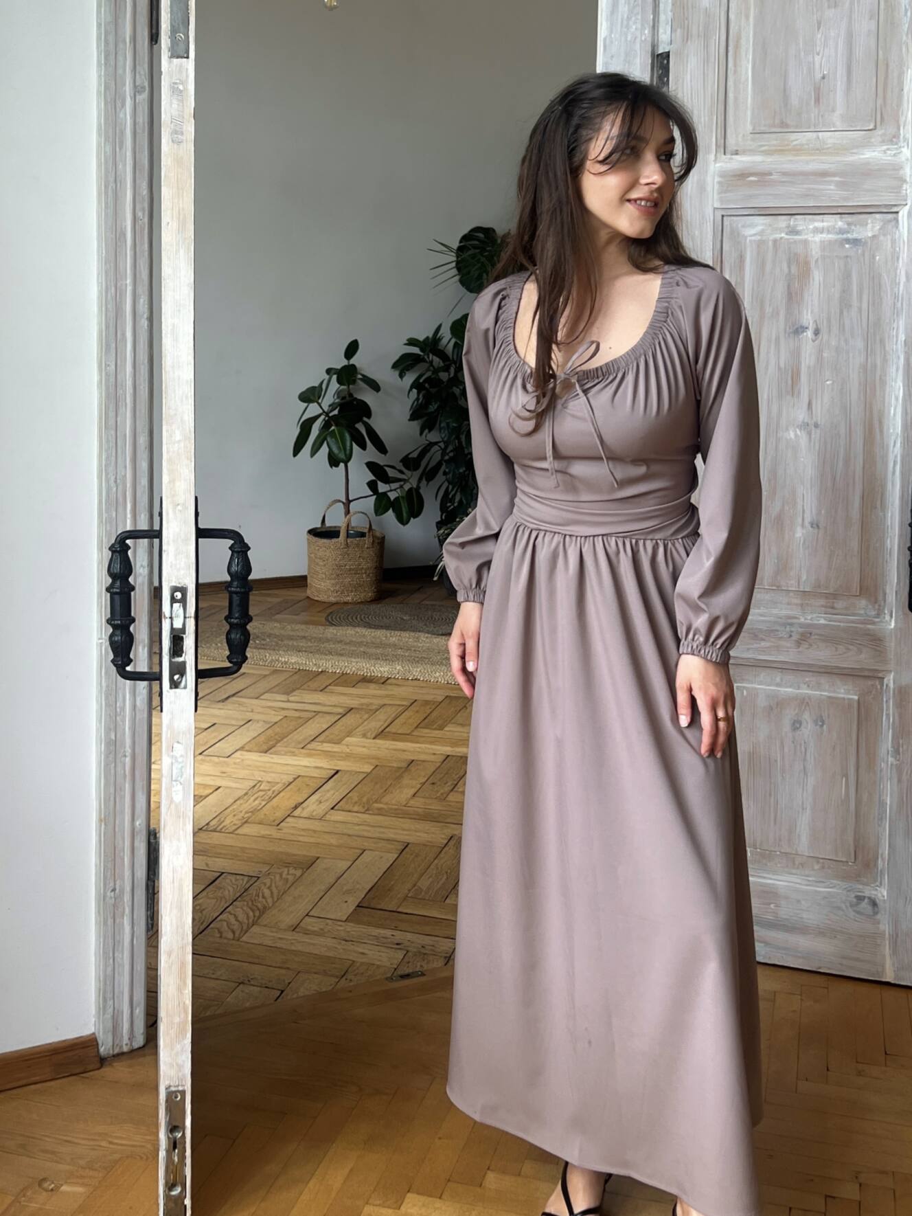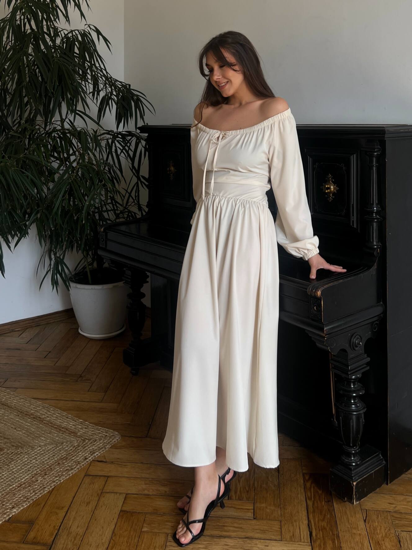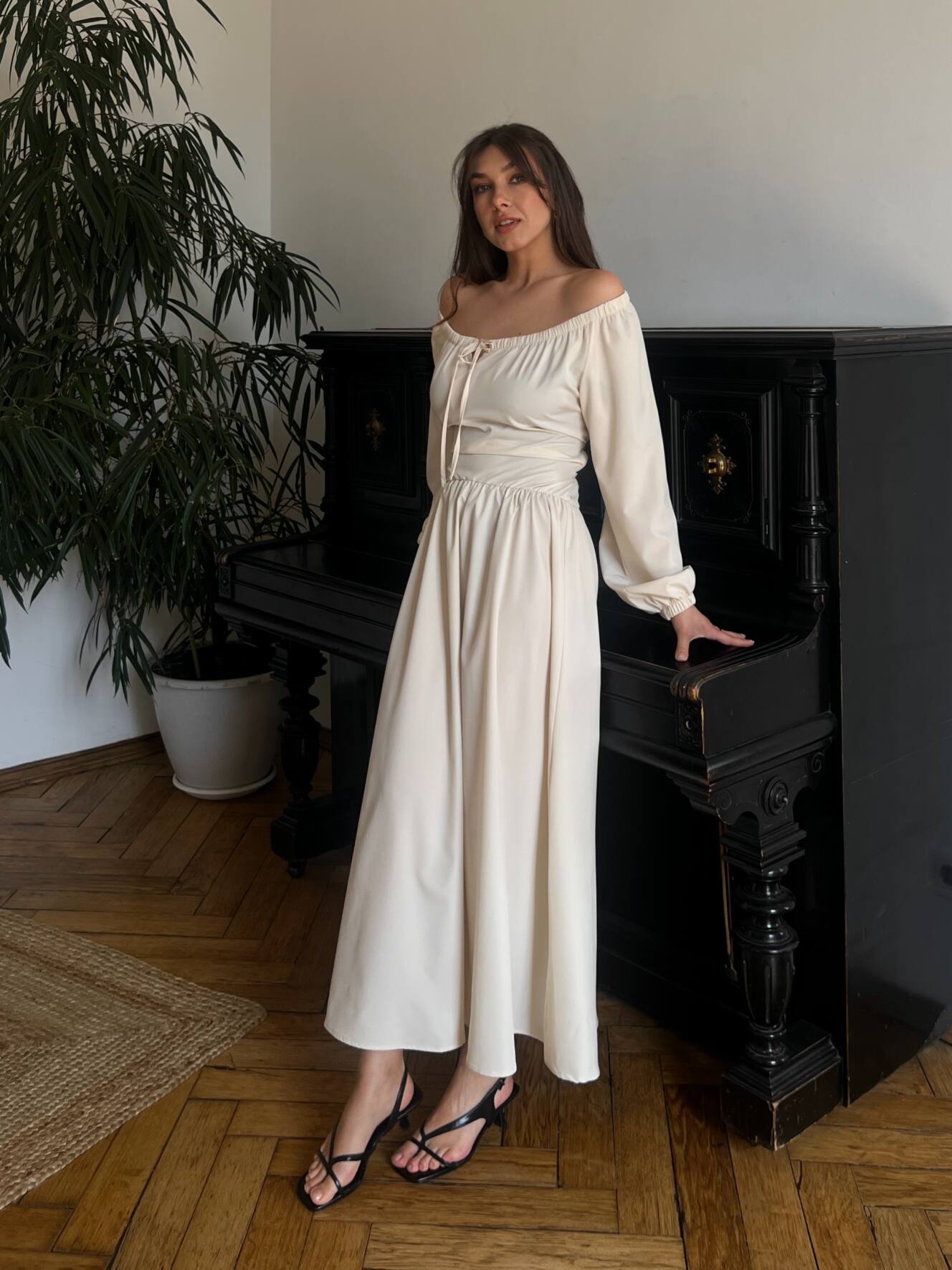 Резинка на плечах дозволяє носити сукню із відкритими плечима — для ніжного, жіночного образу. Довгі рукави з м’якою резинкою знизу створюють легкий об’єм і зручність. На талії — еластична резинка та шнурівка на спині, що дозволяє регулювати посадку під себе.