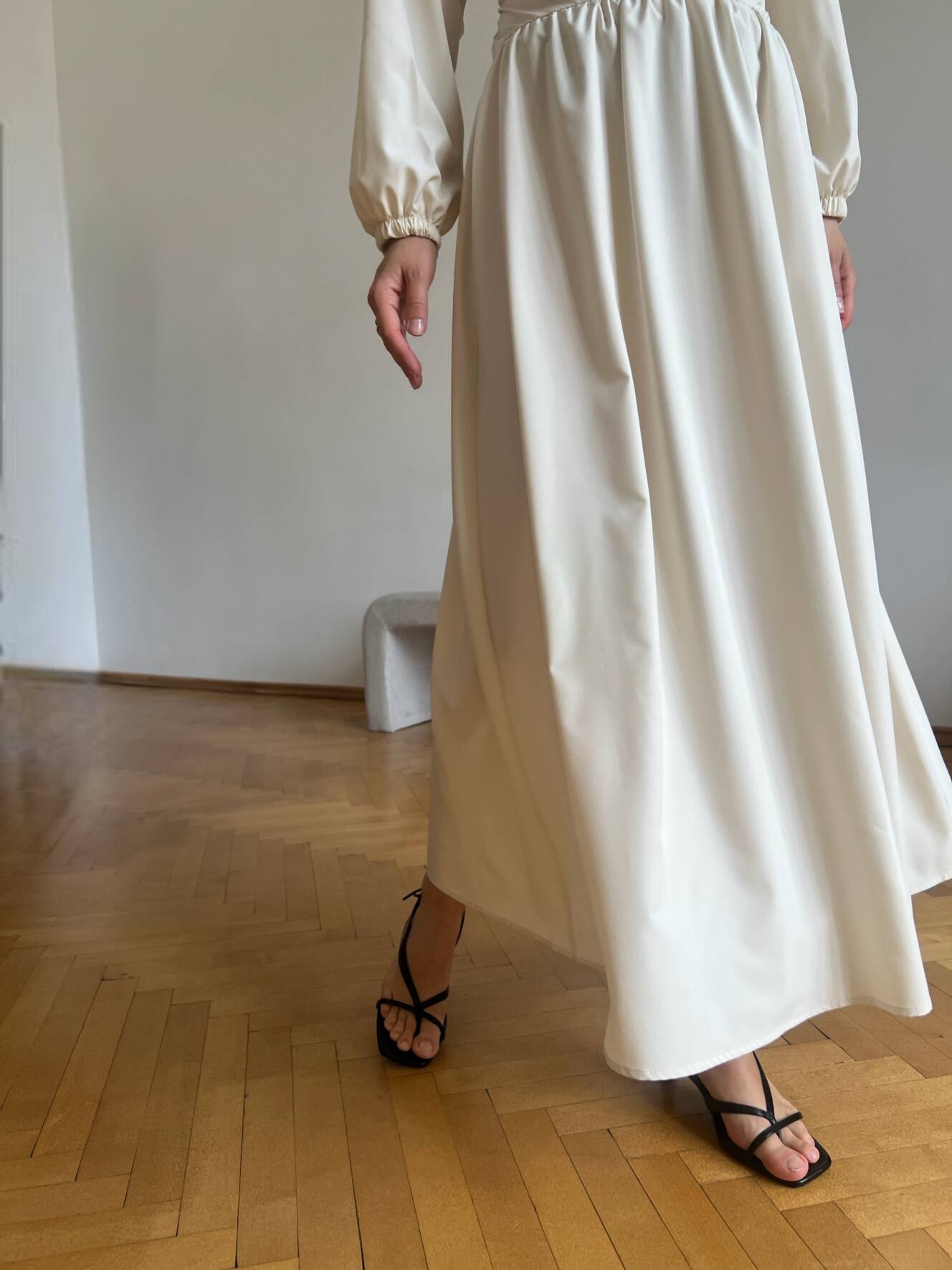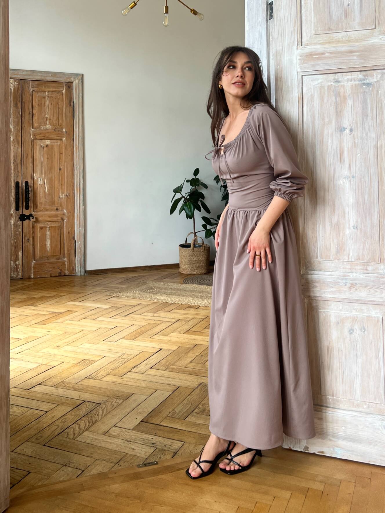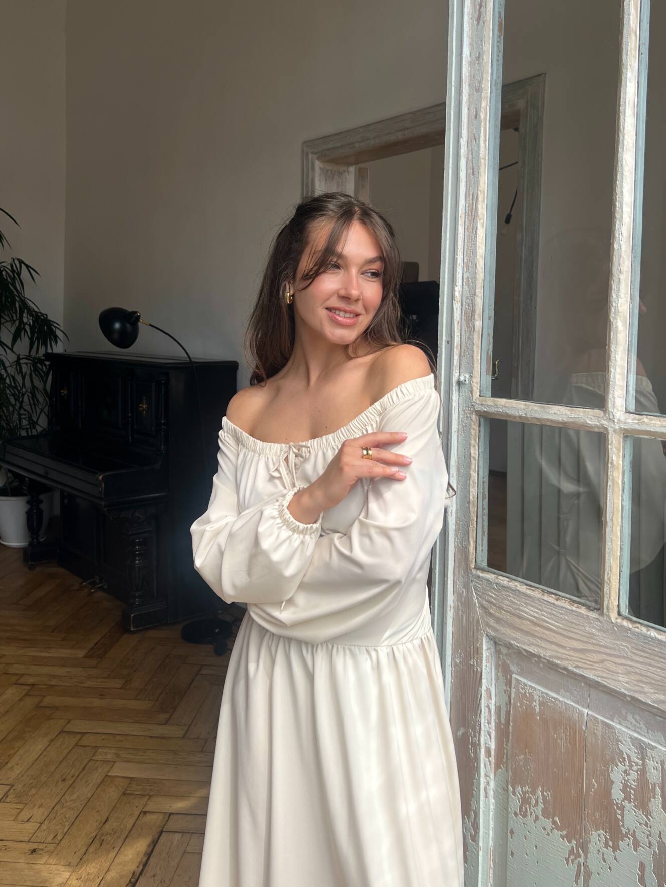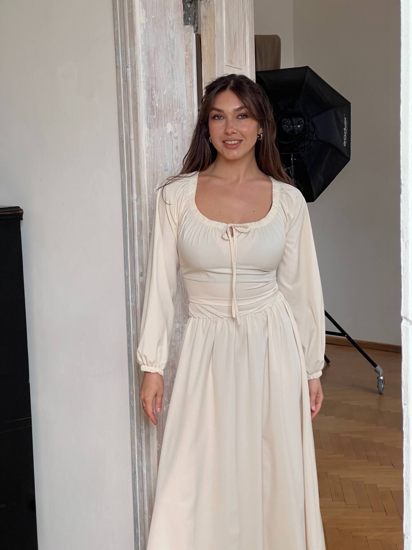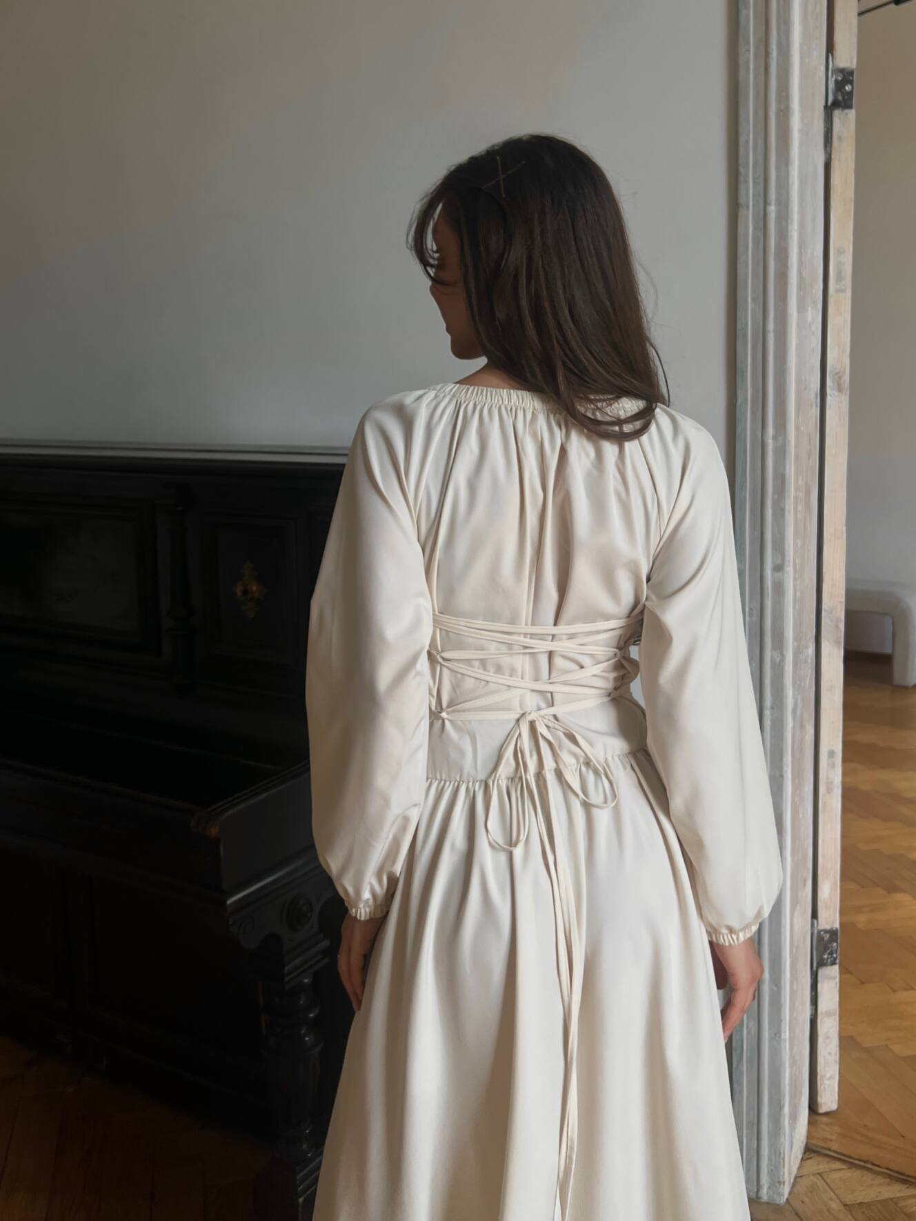 Резинка на плечах дозволяє носити сукню із відкритими плечима — для ніжного, жіночного образу. Довгі рукави з м’якою резинкою знизу створюють легкий об’єм і зручність. На талії — еластична резинка та шнурівка на спині, що дозволяє регулювати посадку під себе.